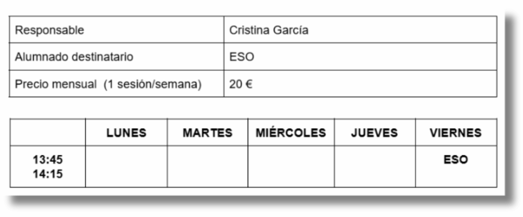 Alumnado ESO: 2 clases semanales a elegir entre lunes, martes, miércoles o viernes 13:50 a 14:20h