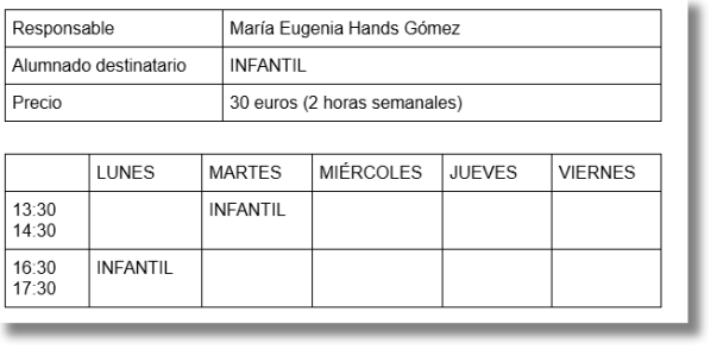 Dos clases semanales de aprovechamiento y reciclaje para la elaboración de manualidades. Clases prácticas en inglés para aprender vocabulario básico (formas, colores, días, números, estaciones) Dirigido a niñas y niños de Educación Infantil.