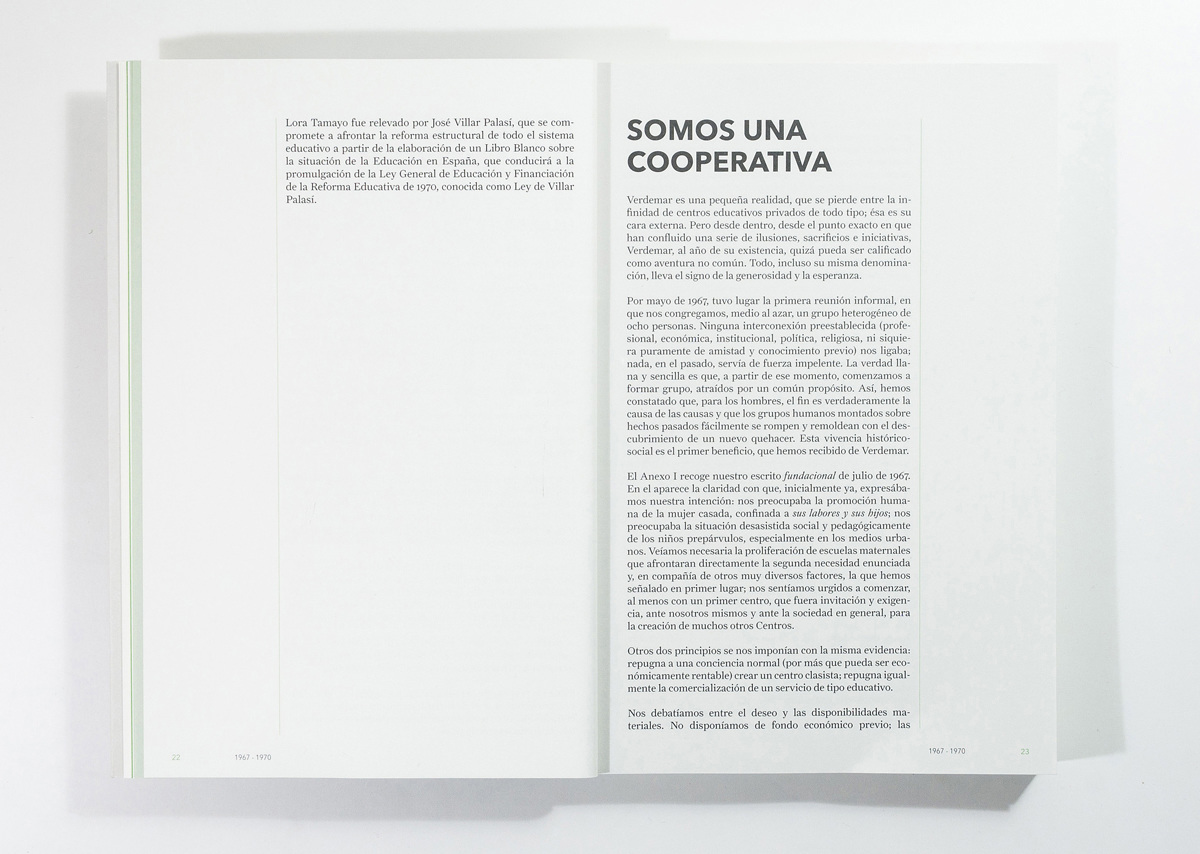 Merece la pena destacar tres principios que forman parte del ideario fundacional del grupo Verdemar, operando como objetivos de su proyecto, y que reflejan a las claras sus compromisos de carácter social y educativo. En primer lugar, como madres y padres que eran, propugnan la creación de un Colegio que libere a la madre del cuidado de los hijos, favoreciendo su promoción laboral, económica, social y cultural fuera del hogar. En segundo lugar, quieren levantar un centro educativo (inexistente en ese momento en el entorno) que acoja a sus hijos e hijas desde la edad maternal, como entonces se decía, y que forme y desarrolle todos los aspectos de su personalidad. En tercer lugar, para hacer frente a los gastos generados por la 14 1967 – 1970 puesta en marcha y funcionamiento del centro, proponen un sistema de cuotas, desde un espíritu cooperativista, que compense las diferencias económicas, de manera que cada familia contribuya de manera desigual según sus posibilidades, para que sus hijos disfruten de iguales oportunidades, allegando también aportaciones de otras personas, bajo la fórmula de socio-amigo, identificadas con los principios del proyecto.