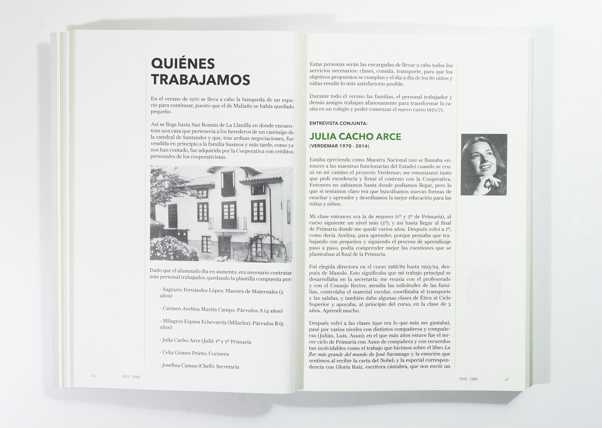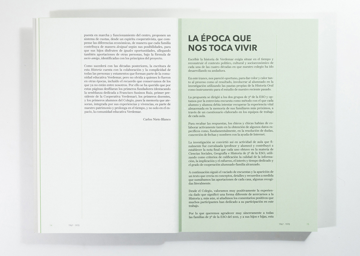 Para conseguirlo, se recopilaron testimonios de todos los grupos que han formado parte de Verdemar: personas fundadoras, personal trabajador, familias y alumnado. La obra no es una historia académica al uso, sino un ejercicio de memoria colectiva que se organiza de manera cronológica. Se trata de una “historia del presente” basada en fuentes orales, donde los recuerdos individuales se convierten en testimonios con valor histórico.