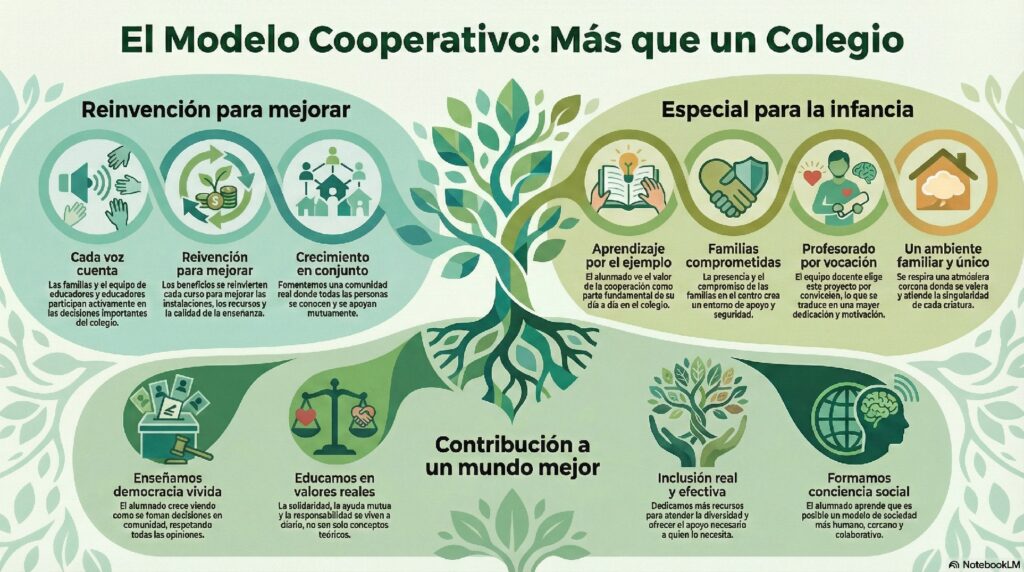 Imagina un colegio donde las familias, el personal auxiliar y el profesorado no son simples espectadores, sino que forman parte activa de su día a día. Donde las decisiones no las toma una persona lejana en una oficina, sino entre toda la comunidad educativa. Eso es precisamente una cooperativa de enseñanza: una comunidad educativa que se gestiona de forma democrática y donde lo más importante son las personas, no los beneficios.
